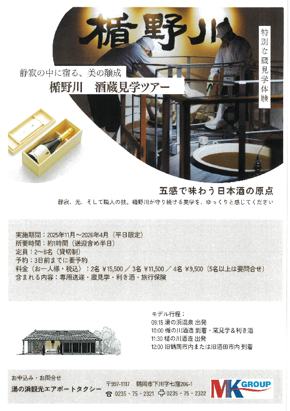 料金にはタクシー代、蔵見学料、利き酒、旅行保険が含まれております。表示料金は1人あたりの税込料金です。