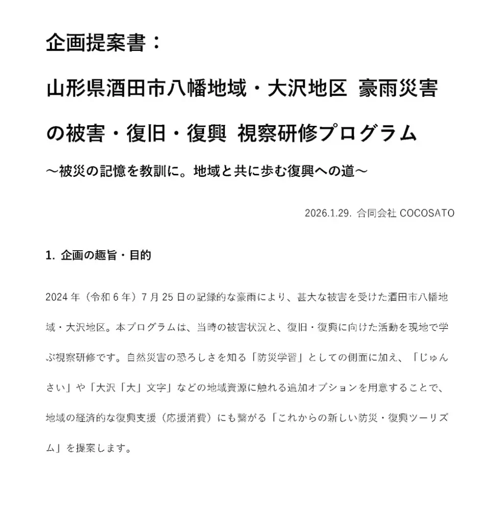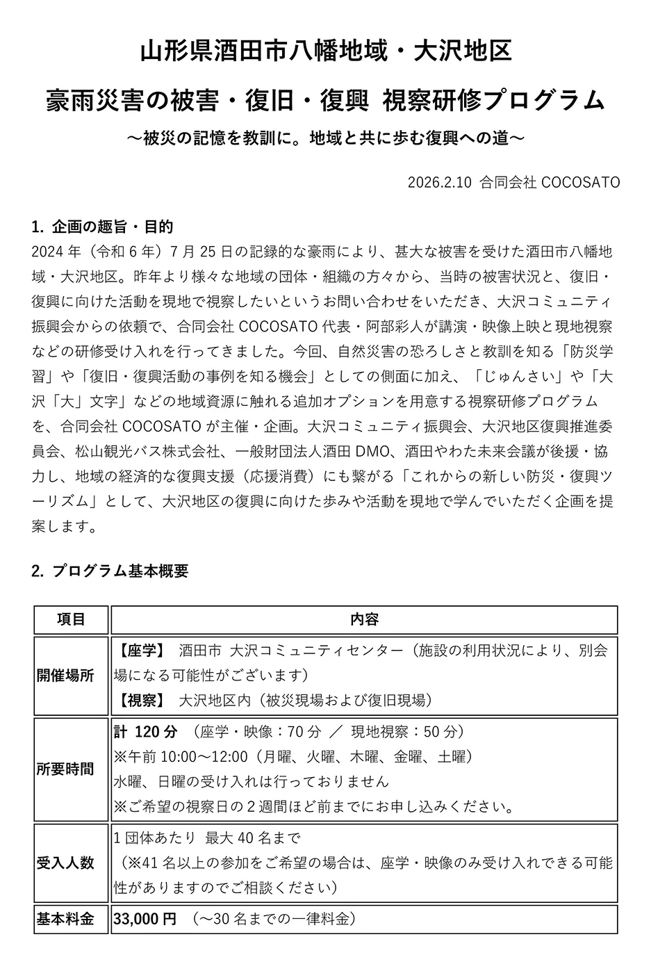 山形県酒田市 大沢地区 復旧・復興 視察研修プログラム