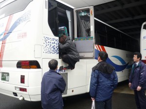 また、非常口の使い方もバスガイドも含め訓練を行いました。一秒でも早くお客様を救助するために一つ一つの動作が的確に対応できるのが大切です。