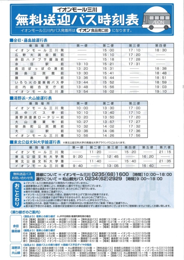 いつもお世話になりましてありがとうございます。このたび4/1よりイオン三川無料送迎バスにおいて東北公益文科大学発着が新設されました。